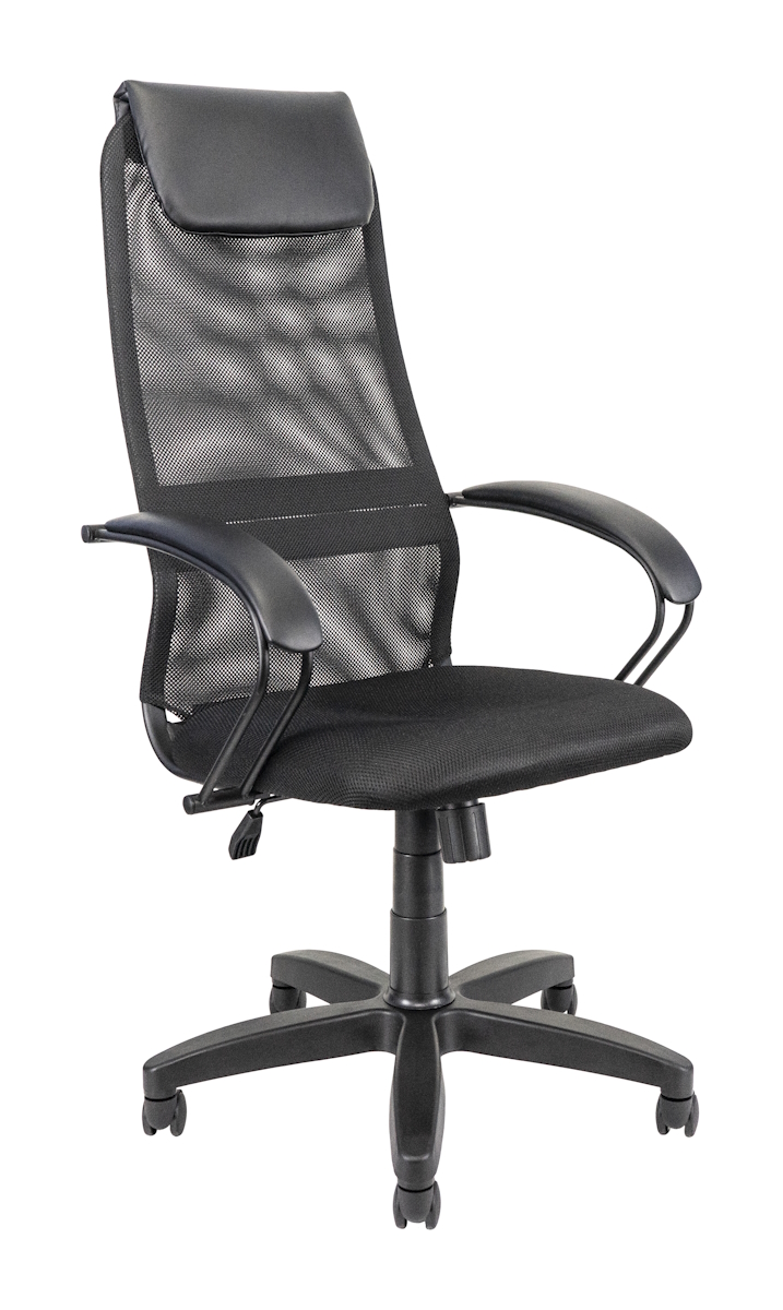 В стандартную комплектацию входит: Металлические подлокотники с накладками, пластиковое пятилучие, полиуретановые ролики. Механизм качания: топган с фиксацией в рабочем положении и регулировкой усилия качания. Обивка спинки: высокопрочная ткань-сетка, сидения: многослойная ткань-сетка.